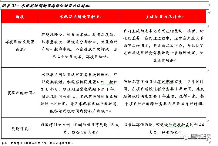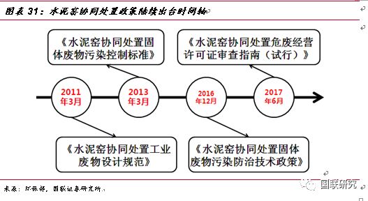水泥窯協(xié)同處置—危廢無害化處置的有益補充。政策刺激下,水泥窯協(xié)同處置危廢應(yīng)運而生。2011年3月,《水泥窯協(xié)同處置工業(yè)廢物設(shè)計規(guī)范》正式出臺,文件對工業(yè)廢物處置規(guī)模、技術(shù)等進行了詳細要求,標(biāo)志著對水泥窯協(xié)同處置政策成熟化的開端。2013年兩高司法提出非法排放、傾倒、處理3噸以上的危廢入刑,從法律層面上對危廢的排放進行了強有力的監(jiān)管,同年3月,《水泥窯協(xié)同處置固體廢物污染控制標(biāo)準(zhǔn)》出臺,規(guī)定了污染排放限值、水泥窯設(shè)施技術(shù)要求以及入窯廢物的特性要求,作為水泥窯協(xié)同處置領(lǐng)域規(guī)范性文件推動了行業(yè)的持續(xù)發(fā)展。2016年12月,《水泥窯協(xié)同處置固體廢物污染防治技術(shù)政策》出臺,文中明確了協(xié)同處置固廢應(yīng)利用現(xiàn)有新型干法水泥窯,采用窯磨一體化的運行方式進行運作,政策發(fā)布之后,新建、改建或擴建處置危險廢物的水泥企業(yè),應(yīng)按照要求選擇單線設(shè)計熟料生產(chǎn)規(guī)模 4000噸/日及以上水泥窯。2017年6月,《水泥窯協(xié)同處置危廢經(jīng)營許可證審查指南(試行)》出臺,對水泥窯協(xié)同處置危廢的適用范圍、術(shù)語定義、經(jīng)營模式及技術(shù)規(guī)范等方面進行了詳細規(guī)定,并將協(xié)同處置的新型干法水泥窯熟料產(chǎn)能的標(biāo)準(zhǔn)重新進行了修訂,由之前4000噸/日調(diào)整下降到2000噸/日,進一步擴大了產(chǎn)能空間。
