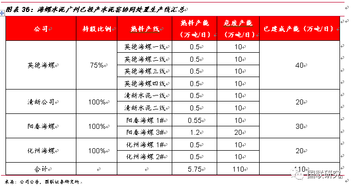 以廣東省為試點,公司攜手海螺創(chuàng)業(yè)深耕危廢領(lǐng)域。公司與海螺創(chuàng)業(yè)將以包括但不限于股權(quán)合作的方式進行廣東省水泥窯協(xié)同處置固廢布點,包括但不限于以《廣東省環(huán)境保護“十三五”規(guī)劃》和《廣東省水泥行業(yè)轉(zhuǎn)型升級技術(shù)路線和行動計劃(2016-2018年)》為指導(dǎo)。根據(jù)“十三五”期間規(guī)劃要求,廣東省水泥窯協(xié)同處置危廢產(chǎn)能為500萬噸/年,據(jù)海螺水泥公司公告統(tǒng)計,其在廣東省內(nèi)共計有4家子公司,分別為英德海螺、清新水泥、化州海螺以及陽春海螺,共計10條投產(chǎn)線,已建成熟料產(chǎn)能分別為2萬噸/日、1萬噸/日、1萬噸/日以及1.75萬噸/日,若全部完成協(xié)同改造,危廢產(chǎn)能總計將達110萬噸/年。