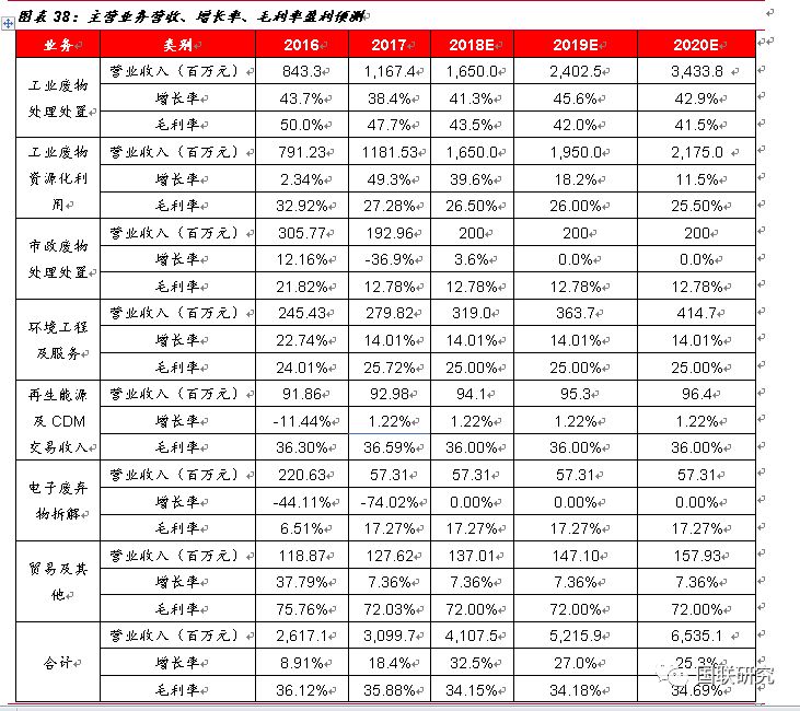 1.河北衡水睿韜項目(無害化)、江西固廢二期(資源化)、福建南平(無害化)、山東濰坊東江(無害化+資源化)、湖北仙桃綠怡(資源化)、江蘇南通(無害化)、泉州PPP項目(無害化+資源化)項目于2018年建成并投產(chǎn)使用。2018-2020年無害化產(chǎn)能分別為110萬噸、155萬噸、205萬噸。2.考慮到后期有部分項目進行技術(shù)升級改造,以及公司正在加大物化業(yè)務(wù)市場拓展和資質(zhì)匹配,2018-2020年產(chǎn)能利用率按照60%、62%、65%進行測算。3.由于目前危廢處置仍然存在較大的供需缺口,暫不考慮價格因素對公司收入的影響,無害化處置價格2018-2020年全部按照2500元/噸進行預(yù)測。4.由于自2016年10月開始大宗商品價格有所回暖,近期趨于穩(wěn)定,根據(jù)上海金屬網(wǎng)價格顯示,金屬銅2016-2017年均價上漲28%,預(yù)計2017-2020年資源化產(chǎn)品價格增幅分別為14%、0%、0%、0%,均價全部按照1500元/噸進行計算,2018-2020年資源化產(chǎn)能按照110萬噸、130萬噸、145萬噸計算。5.保守起見,暫不考慮參股海螺創(chuàng)業(yè)帶來的收入影響。