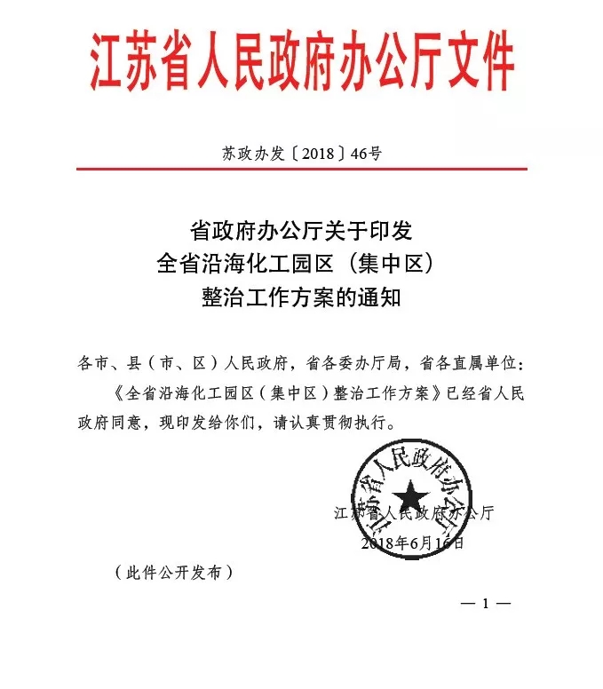 日前,江蘇省辦公廳印發(fā)了《全省沿海化工園區(qū)(集中區(qū))整治工作方案的通知》(蘇政辦發(fā)【2018】46號(hào),下稱46號(hào)文),文件要求對(duì)沿海地區(qū)南通、連云港、鹽城三市轄區(qū)內(nèi)所有化工園區(qū)及園區(qū)內(nèi)所有化工生產(chǎn)企業(yè)進(jìn)行整治。另有消息稱,江蘇省環(huán)保廳也下發(fā)了復(fù)產(chǎn)通知,對(duì)園區(qū)和企業(yè)環(huán)保達(dá)標(biāo)做出具體規(guī)定。