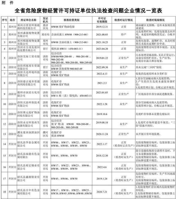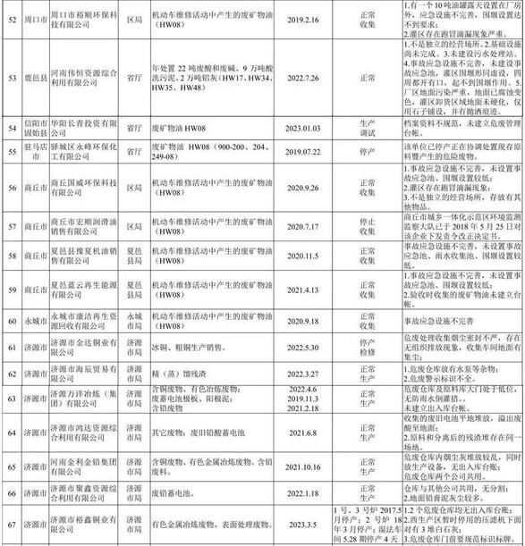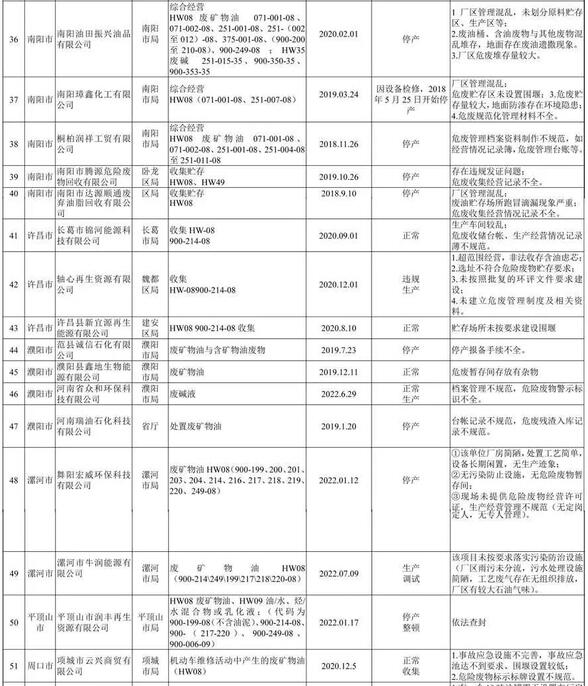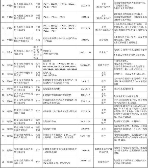 平頂山市潤(rùn)豐再生資源有限公司持有平頂山市環(huán)保局核發(fā)的危險(xiǎn)廢物經(jīng)營(yíng)許可證,經(jīng)營(yíng)范圍中不含"油泥"。但在該企業(yè)廠區(qū)卻發(fā)現(xiàn)堆存約100余噸從浙江、江蘇運(yùn)進(jìn)的油泥,此批危廢未履行跨省轉(zhuǎn)移手續(xù),目前,當(dāng)?shù)毓埠铜h(huán)保部門(mén)均已開(kāi)展偵查調(diào)查;許昌市軸心再生資源有限公司持有許昌市魏都區(qū)環(huán)保局頒發(fā)的廢礦物油收集經(jīng)營(yíng)許可證,現(xiàn)場(chǎng)檢查發(fā)現(xiàn)該公司廠房?jī)?nèi)放有"經(jīng)營(yíng)許可范圍"以外廢機(jī)油濾芯(屬于危險(xiǎn)廢物),涉嫌超范圍經(jīng)營(yíng);鞏義市綠洲廢物處置有限公司2016-2017年連續(xù)兩年超許可規(guī)模經(jīng)營(yíng)。
