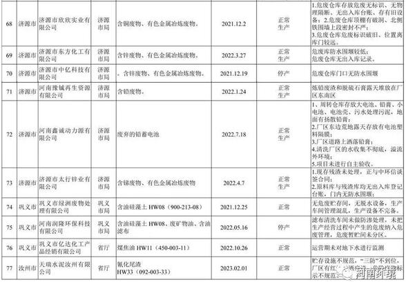 三門(mén)峽鑫華礦冶有限公司2015年運(yùn)營(yíng)期間移入26000噸含鉛玻璃,2016年企業(yè)破產(chǎn)重整停業(yè),但至今庫(kù)存3600多噸含鉛玻璃仍未處置;新鄉(xiāng)市亞洲金屬循環(huán)利用有限公司危廢倉(cāng)庫(kù)內(nèi)存放1638.23噸還原爐渣(疑似危廢),從2013年開(kāi)始生產(chǎn)堆存至今未安全處置;濟(jì)源市太行鋅業(yè)有限公司堆存煉銻殘?jiān)?00多噸,去年至今未處置。