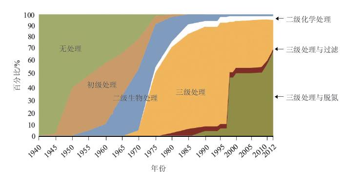 如今,瑞典所有城市家庭的污水在排放到自然之中之前都得到了處理。超過95%的家庭污水都經(jīng)過生物和化學(xué)處理。地處城市地區(qū)以外的約70萬個家庭擁有小型污水處理系統(tǒng)。與擁有自己專門的污水處理廠的工業(yè)源水排放相比,城市地區(qū)以外的家庭所排出的這些小規(guī)模且零散的營養(yǎng)物質(zhì),是瑞典湖泊、河流、沿海水域的富營養(yǎng)化問題更重要的原因。瑞典污水處理問題的歷史發(fā)展如下圖所示。