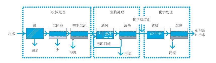 在20世紀(jì)60年代至70年代,瑞典修建了更多現(xiàn)代化的污水處理廠之后,極大地減少了磷和有機物的排放量。近十年來,磷和生化需氧量的處理水平保持在95%左右。另一方面,自2010年起,瑞典的平均氮凈化水平一直維持在60%左右(瑞典環(huán)保署,2014)。從20世紀(jì)80年代中期開始,增加了一些新的凈化方法,確實大幅提高了較大污水處理廠向氮敏感受體排放的氮的凈化水平。污水處理廠的處理過程如圖。