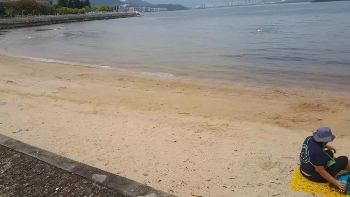 一群日本孩子在香港沙灘上,