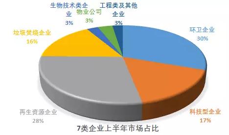 分析發(fā)現(xiàn),按照核心主營業(yè)務(wù)劃分,這一大波項目大致去了7類企業(yè)手中,包括環(huán)衛(wèi)企業(yè)、科技型企業(yè)(這里主要指以IT技術(shù)為核心競爭力、智慧垃圾分類為主業(yè)的企業(yè))、垃圾焚燒企業(yè)、物業(yè)公司、再生資源企業(yè)以及工程類企業(yè)等,具體數(shù)據(jù)如下圖:
