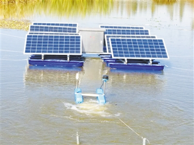 基于中試成果,構(gòu)建集凈化、生態(tài)及適度景觀功能于一體的河—溝—塘—表河口濕地示范工程460多畝,處理規(guī)模為2萬(wàn)~4萬(wàn)m3/d。具體按照多塘系統(tǒng)(沉淀塘、氧化塘和穩(wěn)定塘)、溝—塘—表系統(tǒng)、生態(tài)溝三條工藝路線設(shè)計(jì),總體水力負(fù)荷為0.2 m3/m2.d,示范工程去除率為COD22%~31%, TN11%~47%,NH3-N48%~68%,TP27%~54%,SS51%~ 63%。同時(shí)針對(duì)濕地水動(dòng)力不足,在濕地內(nèi)布設(shè)自主研發(fā)太陽(yáng)能推流曝氣裝置(APP控制,形成專利),提高濕地水體流速3~6cm/s,有效改善濕地水動(dòng)力;針對(duì)濕地末端C/N失調(diào)情況,在濕地內(nèi)設(shè)置固相碳源緩釋區(qū),有效調(diào)整水體C/N比,提高反硝化脫氮效果約10%。