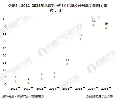 在公開專利數(shù)量方面,2011-2017年,我國危廢處理專利公開數(shù)量總體上呈趨勢。2017年,我國危廢處理專利公開數(shù)量為41項(xiàng),達(dá)到近年來最大值;截至2018年7月,專利公開數(shù)量為39項(xiàng)。