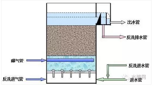 隨著過濾的進行,由于濾料表面新產(chǎn)生的生物量越來越多,截留的SS不斷增加,在開始階段濾池水頭損失增加緩慢,當固體物質(zhì)積累達到一定程度,使水頭損失達到極限水頭損失或?qū)е耂S發(fā)生穿透,此時就必須對濾池進行反沖洗,以除去濾床內(nèi)過量的微生物膜及SS,恢復(fù)其處理能力。