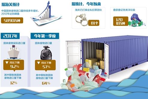 在加強(qiáng)監(jiān)管的同時(shí),海關(guān)等部門還加大了對(duì)“洋垃圾”走私的正面攔截。今年5月22日,全國(guó)海關(guān)開(kāi)展了打擊“洋垃圾”走私“藍(lán)天2018”專項(xiàng)第三輪集中行動(dòng),這是近年來(lái)海關(guān)開(kāi)展的最大規(guī)模打擊“洋垃圾”走私集中行動(dòng)。據(jù)統(tǒng)計(jì),今年以來(lái),海關(guān)已打掉走私犯罪團(tuán)伙81個(gè),查獲查證各類“洋垃圾”120多萬(wàn)噸。