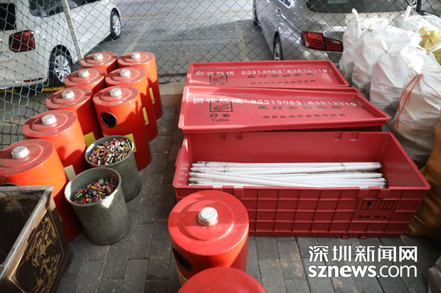 分類好的廢舊電池和燈管等待處理公司回收