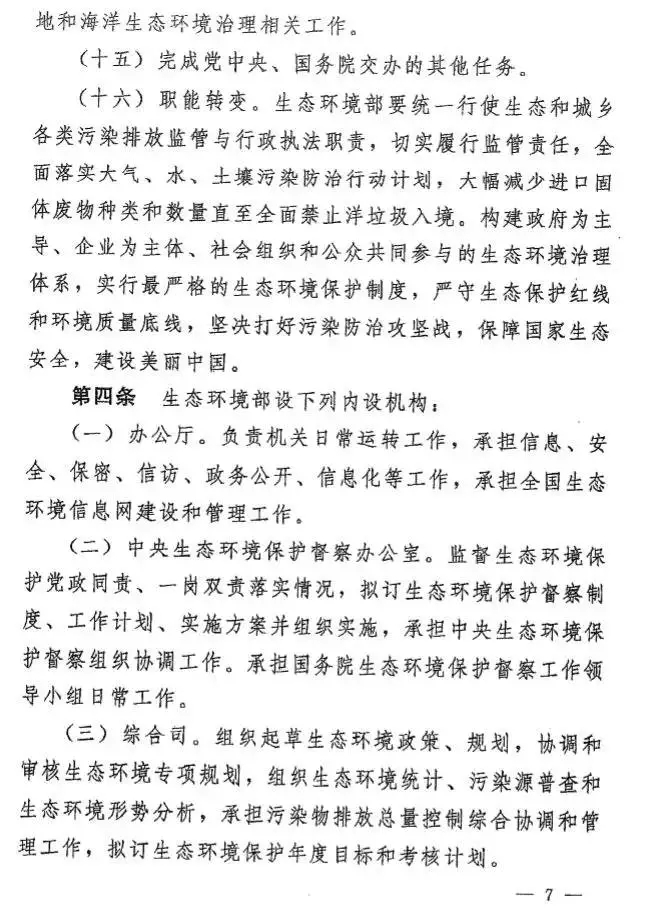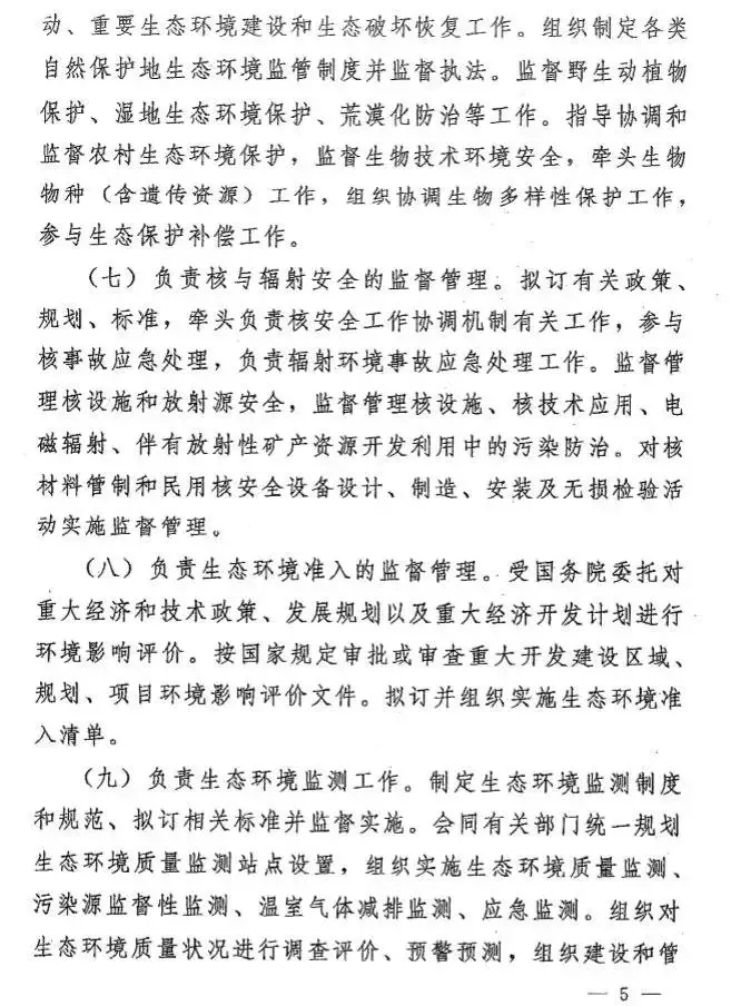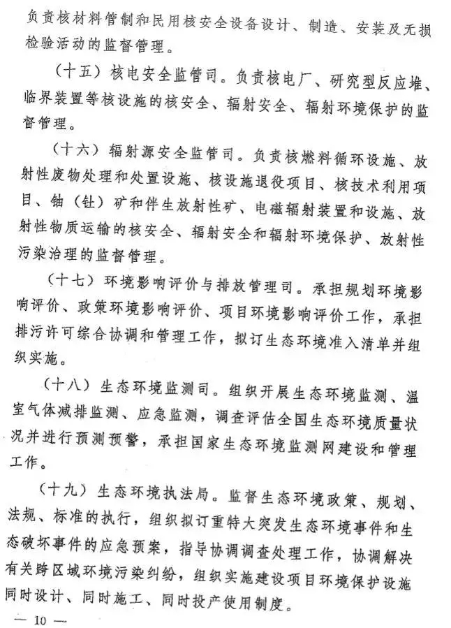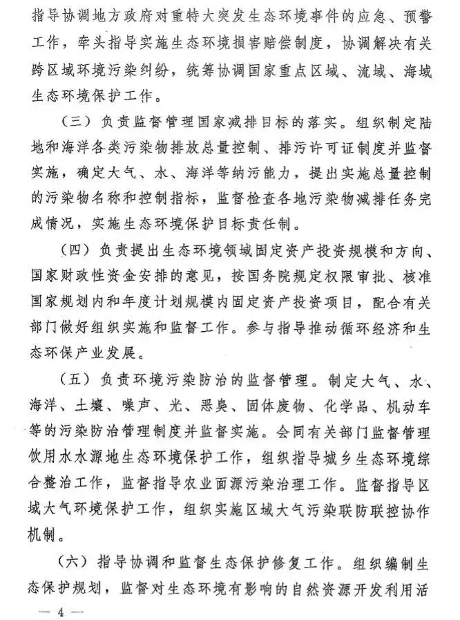 根據(jù)今年國務(wù)院機(jī)構(gòu)改革方案,生態(tài)環(huán)境部負(fù)責(zé)建立健全生態(tài)環(huán)境基本制度,負(fù)責(zé)重大生態(tài)環(huán)境問題的統(tǒng)籌協(xié)調(diào)和監(jiān)督管理,負(fù)責(zé)提出生態(tài)環(huán)境領(lǐng)域固定資產(chǎn)投資規(guī)模和方向、國家財(cái)政性資金安排的意見,以及負(fù)責(zé)環(huán)境污染防治的監(jiān)督管理、生態(tài)環(huán)境準(zhǔn)入的監(jiān)督管理、生態(tài)環(huán)境監(jiān)測、生態(tài)環(huán)境監(jiān)督執(zhí)法等。