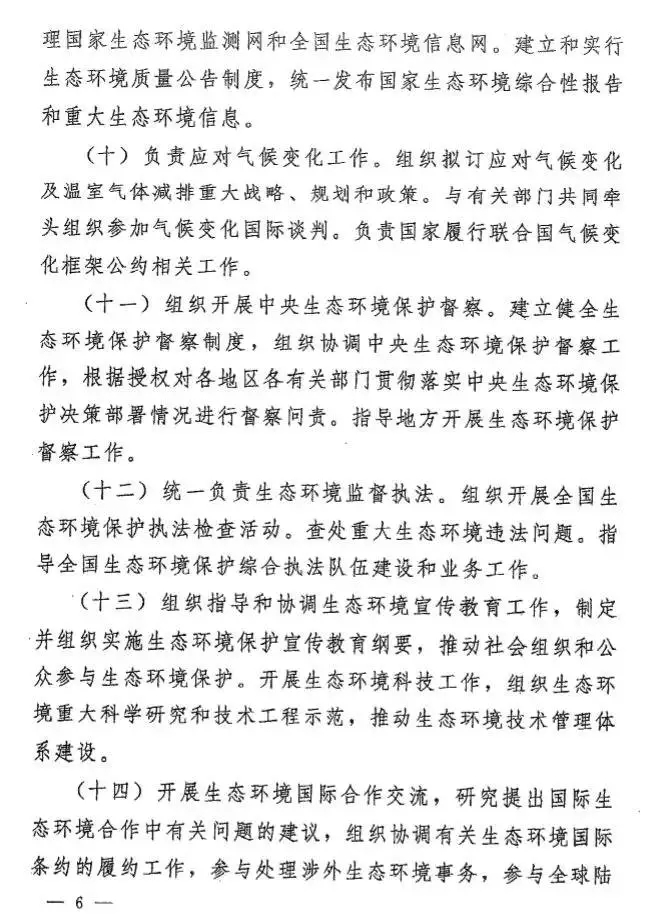 此外,在生態(tài)環(huán)境部的職能中,又增加了幾項(xiàng)重要工作,即負(fù)責(zé)應(yīng)對氣候變化、組織開展中央生態(tài)環(huán)境保護(hù)督察、海洋生態(tài)環(huán)境監(jiān)管等。