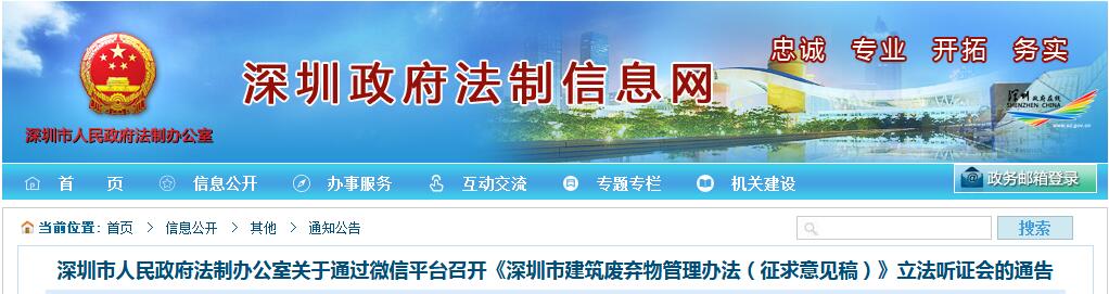 深圳市人民政府法制辦公室關(guān)于通過微信平臺召開《深圳市建筑廢棄物管理辦法(征求意見稿)》立法聽證會的通告