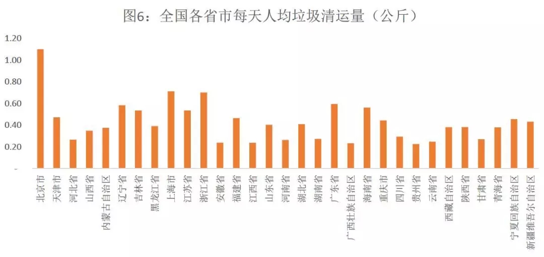下圖為2016年全國(guó)各大省市垃圾清運(yùn)量的數(shù)據(jù),可以看出北京市以每日人均清運(yùn)1.1公斤垃圾領(lǐng)銜全國(guó)首位。該數(shù)據(jù)并不代表北京市居民一定是產(chǎn)生垃圾最多的,因?yàn)槔暹\(yùn)量與垃圾產(chǎn)生量中間有一定差異,且北京的垃圾清運(yùn)率在全國(guó)應(yīng)該是比較充分的。