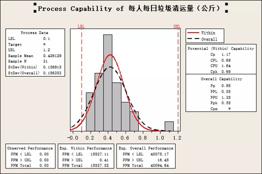 根據(jù)對(duì)每日垃圾清運(yùn)量數(shù)據(jù)的直方圖以及正態(tài)分布圖,可以看出,全國(guó)各大省市的每日人均垃圾清運(yùn)量基本符合正態(tài)分布,其中大部分省市的人均每日清運(yùn)量在0.2-0.6公斤之間,平均值為0.42公斤。