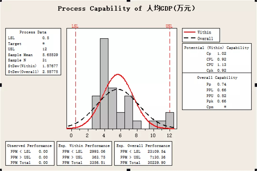 通過(guò)對(duì)全國(guó)各大省市人均GDP直方圖及正態(tài)分布圖進(jìn)行分析,人均GDP的分布也服從正態(tài)分布,大部分省市的年人均GDP位于4-7萬(wàn)元區(qū)間,全國(guó)省市人均GDP均值為5.66萬(wàn)元。