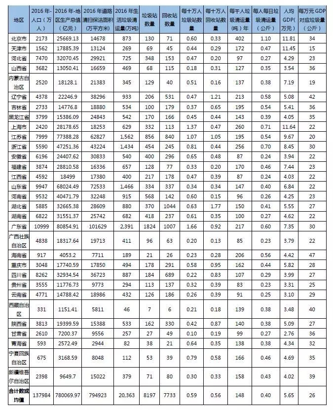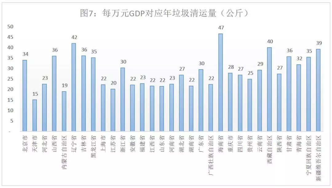從這個(gè)角度將,海南、遼寧省每萬(wàn)元GDP對(duì)應(yīng)的年垃圾清運(yùn)量分別是47、42公斤,居全國(guó)前列。天津市每萬(wàn)元GDP對(duì)應(yīng)年垃圾清運(yùn)量15公斤,不考慮其他因素,單從該數(shù)據(jù)上看,天津的GDP是最“衛(wèi)生”的GDP。
