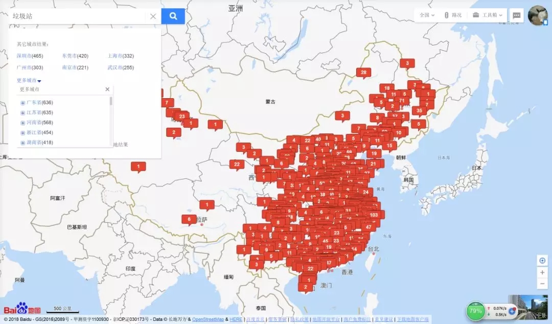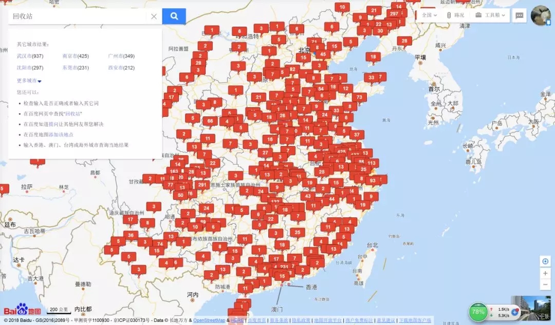 通過(guò)百度地圖對(duì)回收站及垃圾站兩個(gè)關(guān)鍵詞進(jìn)行搜索,出現(xiàn)如下兩張圖注1,垃圾站與回收站恐怕是普通居民最不愿意接觸的地方之一,但是通過(guò)百度地圖搜索,作者發(fā)現(xiàn),垃圾站和回收站幾乎是人口和經(jīng)濟(jì)的標(biāo)志之一,哪里人口密集和經(jīng)濟(jì)發(fā)達(dá),哪里的垃圾站和回收站就密集,根據(jù)對(duì)百度地圖數(shù)據(jù)統(tǒng)計(jì),全國(guó)垃圾站數(shù)量、回收站數(shù)量分別為8197個(gè)、7733個(gè),其中北京市垃圾站、回收站數(shù)量分別為130個(gè)、71個(gè)。