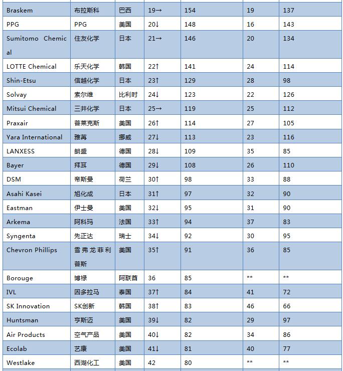 中國企業(yè)方面,除了中石化和臺塑以外,又有一家實力雄厚企業(yè)進入榜單-萬華化學,另外先正達已被中國化工收購,中國上榜企業(yè)達到4家和韓國齊平。