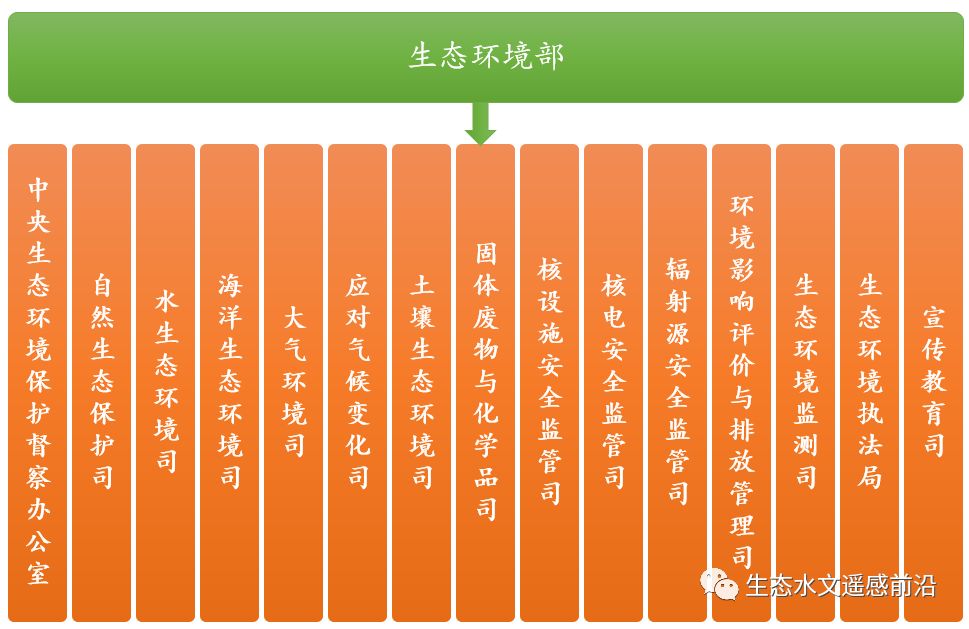 生態(tài)環(huán)境部、自然資源部、國家林業(yè)和草原局、水利部除設(shè)置辦公廳、綜合司、法規(guī)司、人事司、財務(wù)司、國際合作司、機關(guān)黨委和離退休干部辦公室等司局外,生態(tài)環(huán)境部還下設(shè)中央生態(tài)環(huán)境保護督察辦公室、自然生態(tài)保護司(生物多樣性保護辦公室、國家生物安全管理辦公室)、水生態(tài)環(huán)境司、海洋生態(tài)環(huán)境司、大氣環(huán)境司(京津冀及周邊地區(qū)大氣環(huán)境管理局)、應(yīng)對氣候變化司、土壤生態(tài)環(huán)境司、固體廢物與化學(xué)品司、核設(shè)施安全監(jiān)管司、核電安全監(jiān)管司、輻射源安全監(jiān)管司、環(huán)境影響評價與排放管理司、生態(tài)環(huán)境監(jiān)測司、生態(tài)環(huán)境執(zhí)法局、宣傳教育司等機構(gòu)。