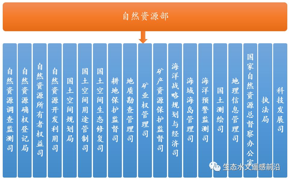 生態(tài)環(huán)境部設(shè)立自然生態(tài)保護司等23個內(nèi)設(shè)機構(gòu);自然資源部設(shè)立自然資源調(diào)查監(jiān)測司等27個內(nèi)設(shè)機構(gòu);國家林業(yè)和草原局設(shè)立生態(tài)保護修復(fù)司等17個內(nèi)設(shè)機構(gòu);水利部設(shè)立水資源管理司等22個內(nèi)設(shè)機構(gòu)。