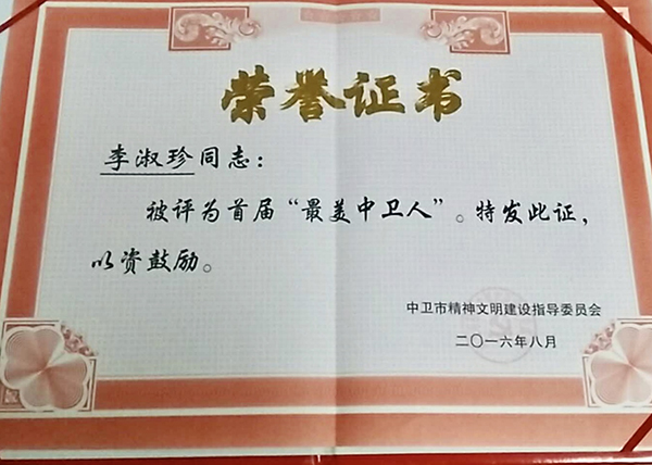 中衛(wèi)市還將環(huán)衛(wèi)工人列入“感動中衛(wèi)人物”、“市級勞?!钡仍u先選優(yōu)范圍,進(jìn)一步激發(fā)了環(huán)衛(wèi)工的榮譽感和勞動熱情。圖為環(huán)衛(wèi)工人李淑珍取得的“最美中衛(wèi)人”榮譽證書。光明網(wǎng)王麗媛/攝
