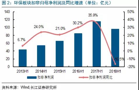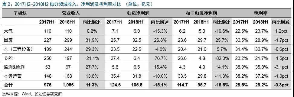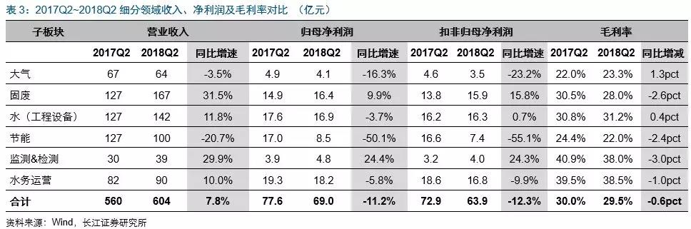 2018Q2環(huán)保板塊營(yíng)收604億元,同比增7.8%;歸母凈利潤(rùn)69億元,同比減11.2%;扣非歸母凈利63.9億元,同比降12.3%;毛利率同比降0.6pct至29.5%。營(yíng)收增速排序分別為固廢(31.5%)、檢測(cè)&監(jiān)測(cè)(29.9%)、水(工程設(shè)備)(11.8%)、水務(wù)運(yùn)營(yíng)(10%)、大氣(-3.5%)及節(jié)能(-20.7%);扣非歸母凈利增速排序?yàn)楸O(jiān)測(cè)&檢測(cè)(24.3%)、固廢(15.8%)、水(工程設(shè)備)(0.7%)、水務(wù)運(yùn)營(yíng)(-9.9%)、大氣(-23.2%)及節(jié)能(-55.1%)。