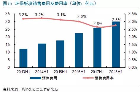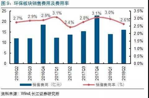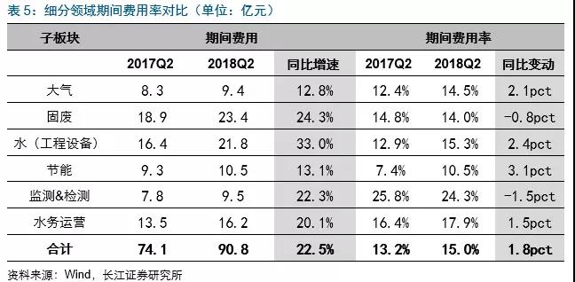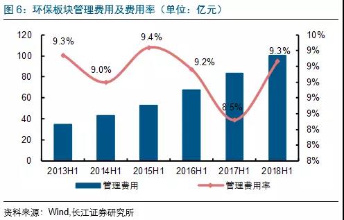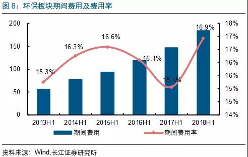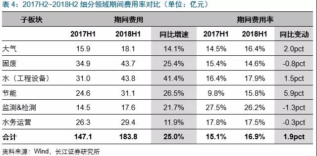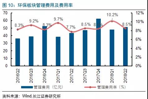 2018H1各板塊期間費(fèi)用增速排序分別為:水(工程設(shè)備)(43.8億,同比增41.4%)、節(jié)能(31.1億,同比增26.5%)、固廢(43.7億,同比增25.4%)、監(jiān)測(cè)&檢測(cè)(17.6億,同比增21.7%)、大氣(18.1億,同比增14.1%)及水務(wù)運(yùn)營(yíng)(29.4億,同比增11.9%)板塊。
