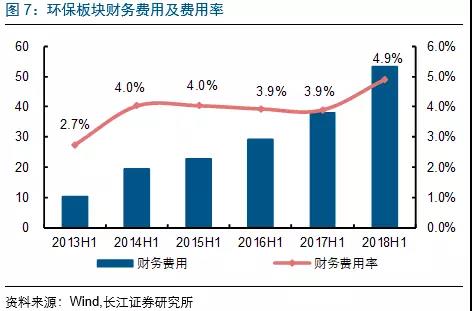 2018H1環(huán)保板塊期間費(fèi)用累計(jì)支出約183.8億元,同比增25%,期間費(fèi)用率增1.9pct至16.9%。費(fèi)用率方面,銷售費(fèi)用率2.8%,同比增0.2pct;管理費(fèi)用率9.3%,同比增0.8pct;財(cái)務(wù)費(fèi)用率4.9%,同比增1pct。2018H1期間費(fèi)用率在同比抬升一方面與營(yíng)收總體增速放緩有關(guān),另一方面與融資成本提升導(dǎo)致財(cái)務(wù)費(fèi)用率提升較快有關(guān)。