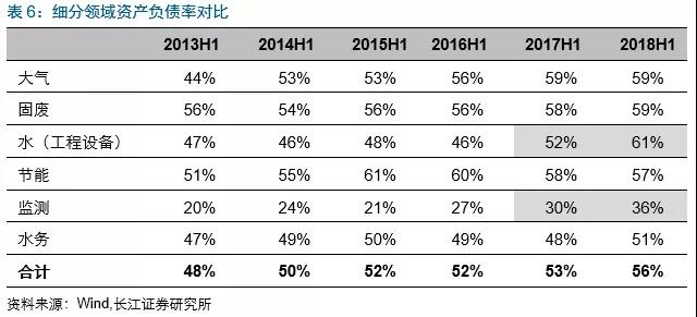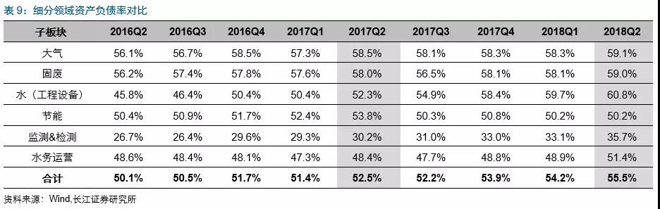 2018Q2水(工程設(shè)備)及監(jiān)測(cè)&檢測(cè)板塊資產(chǎn)負(fù)債率同比提升較快,分別提升8.5pct、5.5pct至60.8%、35.7%。
