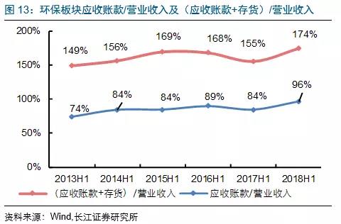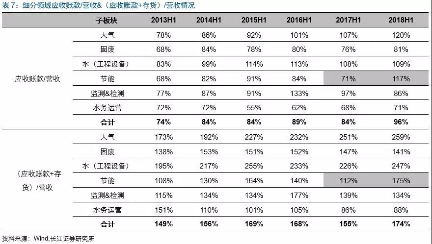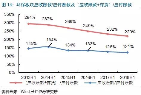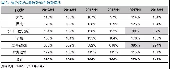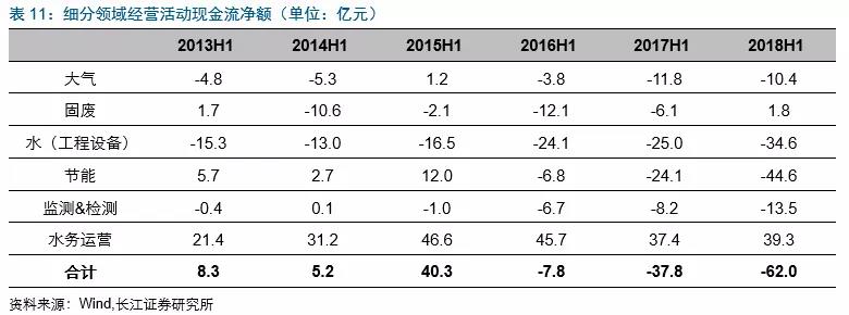 2018H1固廢板塊經(jīng)營(yíng)活動(dòng)產(chǎn)生現(xiàn)金流凈額改善較多,主要受益于中再資環(huán)(補(bǔ)貼款回款增加,由-5.5億到3.2億)、東江環(huán)保(議價(jià)能力提升,回款加速,同時(shí)預(yù)收款增加較快,由0.9億到3億)、格林美(由1億到4.2億)經(jīng)營(yíng)現(xiàn)金流凈額改善明顯;節(jié)能板塊下滑較大主要受到三聚環(huán)保(-20.4億到-32.3億)、神霧環(huán)保(由0.7億到-3.9億)、神霧節(jié)能(由3.4億到-0.8億)經(jīng)營(yíng)現(xiàn)金流凈額惡化較快的影響。水(工程設(shè)備)板塊經(jīng)營(yíng)活動(dòng)現(xiàn)金流凈額繼續(xù)走低,主要受到碧水源(由-7億到-13.6億)及天翔環(huán)境(由0.5億到-9.7億)的影響。