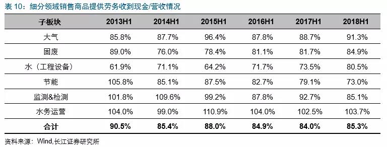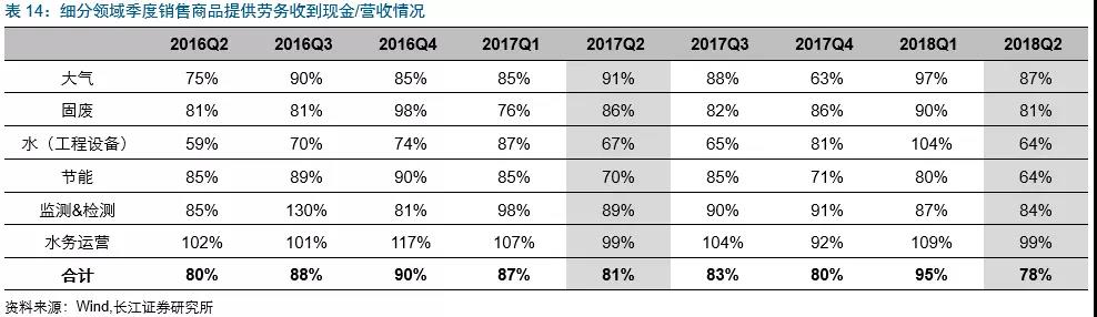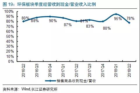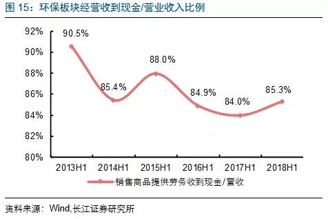 2018Q2環(huán)保板塊銷售商品收到現(xiàn)金/營(yíng)收(收現(xiàn)比)比率為78%,同比降3pct,各板塊除了水務(wù)其他收現(xiàn)比同比均出現(xiàn)回調(diào)。