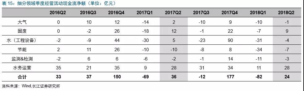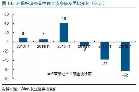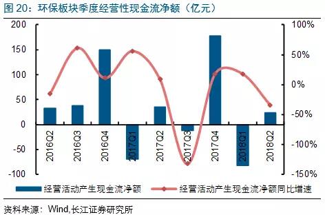 環(huán)保板塊中,僅有水務(wù)運(yùn)營(yíng)板塊現(xiàn)金流相對(duì)可觀,其他板塊現(xiàn)金流均較差;但環(huán)比2018Q1均有多改善。