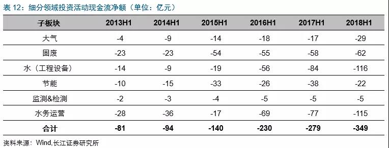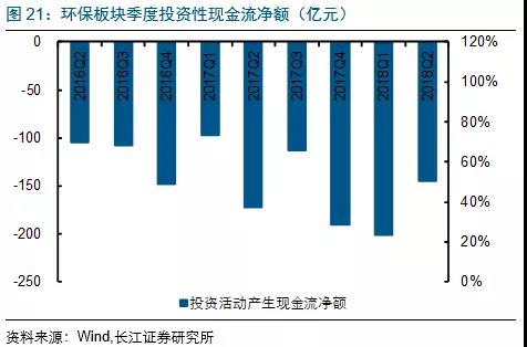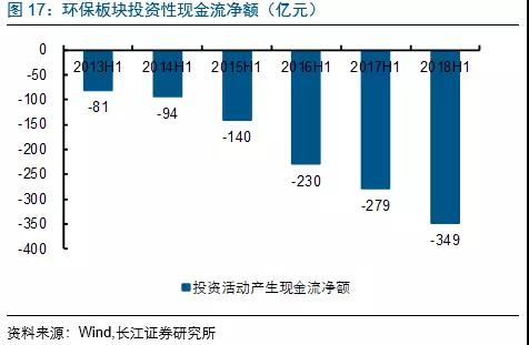 2018H1水(工程設(shè)備)板塊投資活動(dòng)產(chǎn)生現(xiàn)金流凈額下滑較多,主要受到東方園林投資活動(dòng)現(xiàn)金流凈額增加較多(由-8億到-27億)的影響;大氣投資活動(dòng)現(xiàn)金流凈額增加較多主要受龍凈環(huán)保購(gòu)買華泰保險(xiǎn)4.9%股權(quán)支出約17.6億(目前已支付14個(gè)多億)的影響。