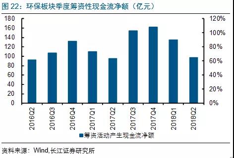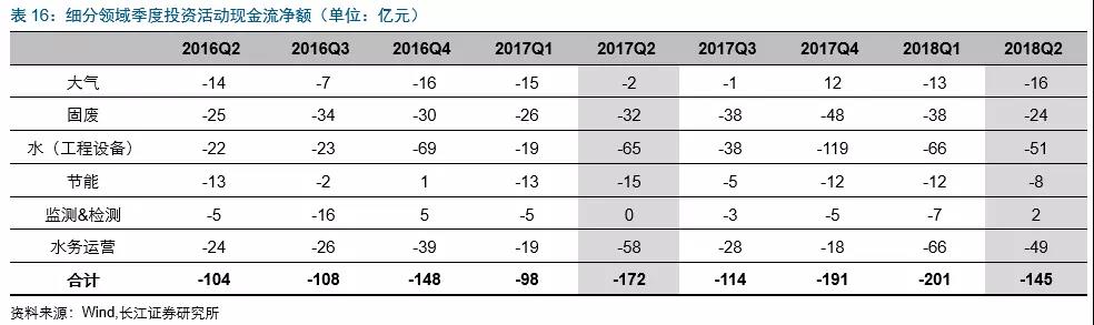 2018Q2大氣板塊因龍凈環(huán)保購(gòu)買華泰保險(xiǎn)4.9%股權(quán)支付17.6億(Q2支付14個(gè)多億)的影響投資活動(dòng)現(xiàn)金流凈額略有下滑(絕對(duì)值變大),固廢&水(工程設(shè)備)等偏PPP類板塊投資活動(dòng)現(xiàn)金流凈額均有所收縮(絕對(duì)值減小)。