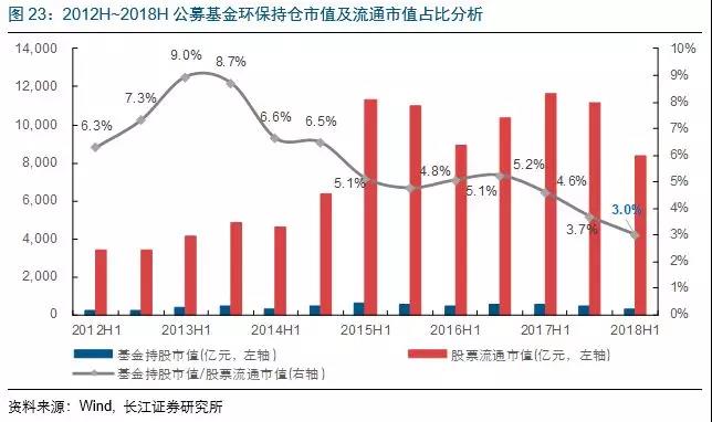 從環(huán)保公司的公募基金歷史持倉(cāng)數(shù)據(jù)來(lái)看,2018H1基金持股總市值約為252億元,占公司總流通市值的3.0%,處于歷史底部。