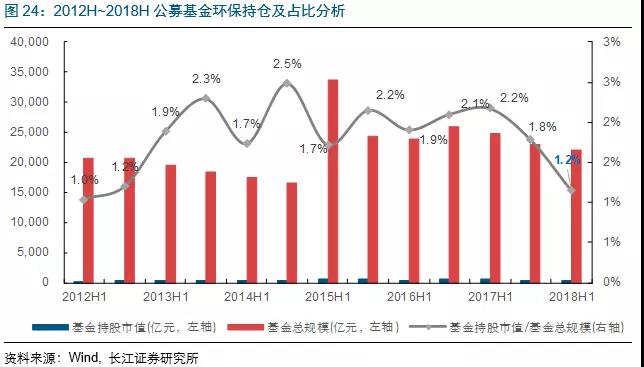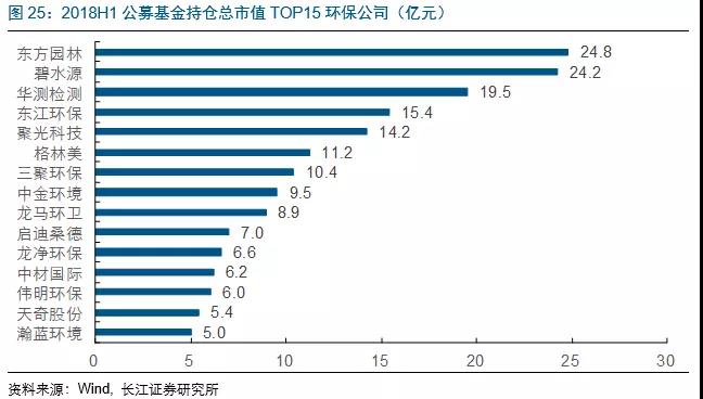 2018H1基金持股總市值約為252億元,占公司流通市值3.0%,處于歷史底部,持倉(cāng)占基金規(guī)模1.2%,同比降1pct;募基金配置較多的股票有東方園林(24.8億元)、碧水源(24.2億元)、華測(cè)檢測(cè)(19.5億元)、東江環(huán)保(15.4億元)、聚光科技(14.2億元)、格林美(11.2億元)、三聚環(huán)保(10.4億元)等公司。