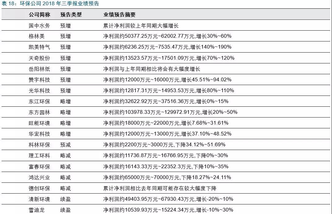 截至9月2日,已有30個(gè)環(huán)保公司公布三季度業(yè)績(jī)預(yù)告,其中預(yù)增或略增的有11家,略減或續(xù)盈的有10家,虧損的有9家,業(yè)績(jī)?cè)鏊傧禄蛱潛p公司比例較多。受宏觀融資環(huán)境和環(huán)保監(jiān)管環(huán)境趨嚴(yán)影響,部分龍頭企業(yè)業(yè)績(jī)?cè)鏊俨焕硐?,三季度需關(guān)注信貸政策邊際變化和公司項(xiàng)目/訂單落地進(jìn)度。