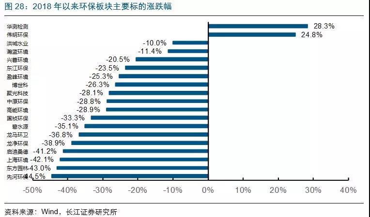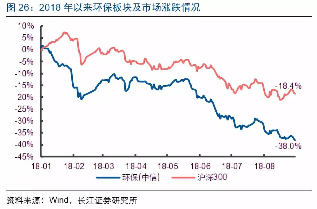 2018年初以來(lái)中信環(huán)保指數(shù)下跌38%,同期滬深300指數(shù)下跌18.4%,板塊跑輸指數(shù)19.6pct,該時(shí)段內(nèi)的華測(cè)檢測(cè)(+28.3%)、偉明環(huán)保(+24.8%)等公司漲幅位居前列。