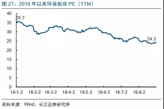 目前環(huán)保板塊PE(TTM)已從2018年初的35.7x降至當(dāng)前的24.3x,多數(shù)標(biāo)的處于歷史估值低位;但目前部分板塊出現(xiàn)業(yè)績(jī)?cè)鏊俜啪徤踔霖?fù)增長(zhǎng)的情況,低PE安全邊際有待觀察。