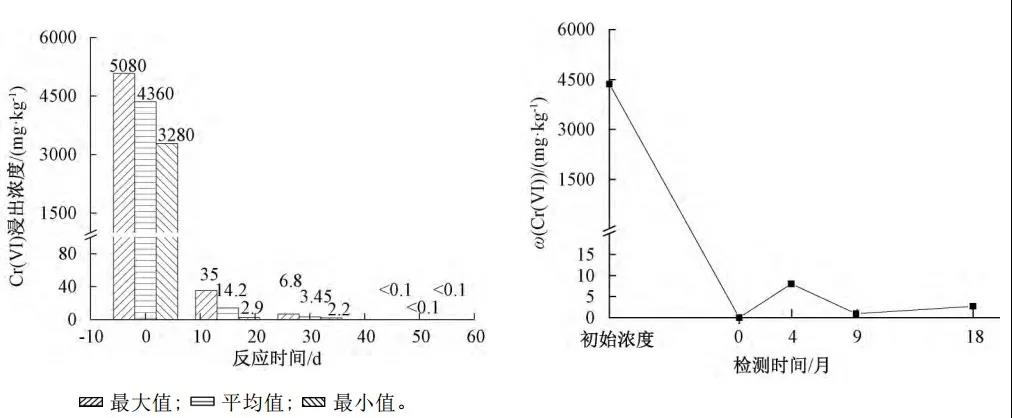 中試測(cè)試中,Cr(Ⅵ)最高濃度達(dá)5080mg/kg,理論藥劑投加比為10.1%,實(shí)際投加比為12%。反應(yīng)15d后,Cr(Ⅵ)還原率達(dá)99.9%以上,50d后,Cr(Ⅵ)無(wú)檢出,還原率達(dá)到100%,實(shí)際應(yīng)用效果良好,可應(yīng)用于大規(guī)模生產(chǎn)。