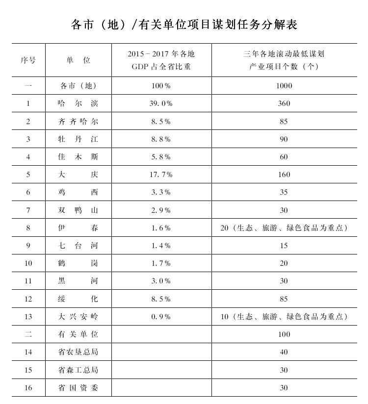 3.落實產(chǎn)業(yè)項目謀劃任務(wù)。堅持產(chǎn)業(yè)項目謀劃與各地經(jīng)濟規(guī)模相匹配原則,哈爾濱、大慶、齊齊哈爾、牡丹江、佳木斯、綏化等主要城市在項目謀劃上要有更大擔當,更好的發(fā)揮省會城市示范作用、釋放中心城市帶動作用,激活周邊區(qū)域要素,促進區(qū)域協(xié)同發(fā)展。資源型地區(qū)要強化轉(zhuǎn)型發(fā)展,煤城突出現(xiàn)代煤化工和非煤替代產(chǎn)業(yè)項目謀劃工作,林區(qū)突出生態(tài)旅游、林下資源開發(fā)、綠色有機食品等項目儲備。沿邊地區(qū)要發(fā)揮地緣優(yōu)勢,突出開發(fā)外向型產(chǎn)業(yè)項目。按照各地2015年至2017年經(jīng)濟總量占全省的比重,并考慮各地間的適度均衡,確定各地三年謀劃產(chǎn)業(yè)項目最低目標,鼓勵各地超額完成任務(wù)。