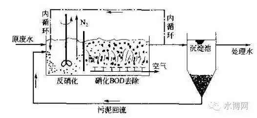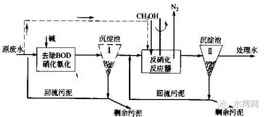 如果將有機(jī)物去除和硝化放在同一個(gè)反應(yīng)器中進(jìn)行,而將反硝化作用放在另一個(gè)反應(yīng)器中進(jìn)行,則可以將三級生物脫氮系統(tǒng)簡化為兩級生物脫氮系統(tǒng)。如下圖: