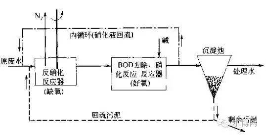 (2)前置反硝化生物脫氮系統(tǒng)又稱缺氧-好氧活性污泥脫氮系統(tǒng)、A/0生物脫氮流程、改良LudMck-Euinger工藝等。前置反硝化是目前使用比較廣泛的一種脫氮工藝(分建式缺氧好氧活性污泥脫氮系統(tǒng)如下圖)。