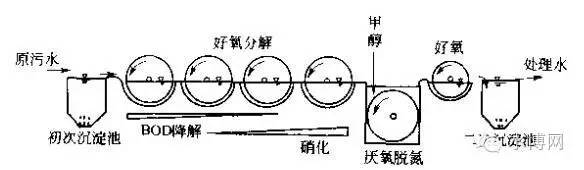 ②污泥齡長,產(chǎn)泥量少。由于生物膜上存在的食物鏈較因此產(chǎn)泥量少,剩余污泥的處理量僅為活性污泥法的一半左右。在生物轉(zhuǎn)盤上還可以生長世代時(shí)間較長的硝化菌,因此如果得當(dāng),除有效去除有機(jī)物外,還能夠具有硝化和反硝化脫氮的作用,其工藝流程如下圖: