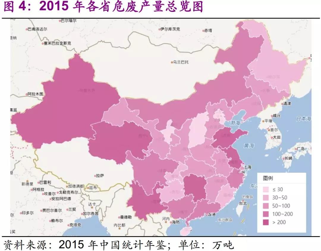 分省來看,共有14個省增速在50%以上,寧夏、海南、福建、甘肅、四川、吉林6省增速超100%,其中寧夏由2015年的9.75萬噸上升至2016年49.66萬噸,增速高達(dá)403%。產(chǎn)廢量大于200萬噸的省份由6個上升至11個,危廢產(chǎn)量前五名的省份中,江蘇由第5名上升至第3名,超越新疆、湖南。