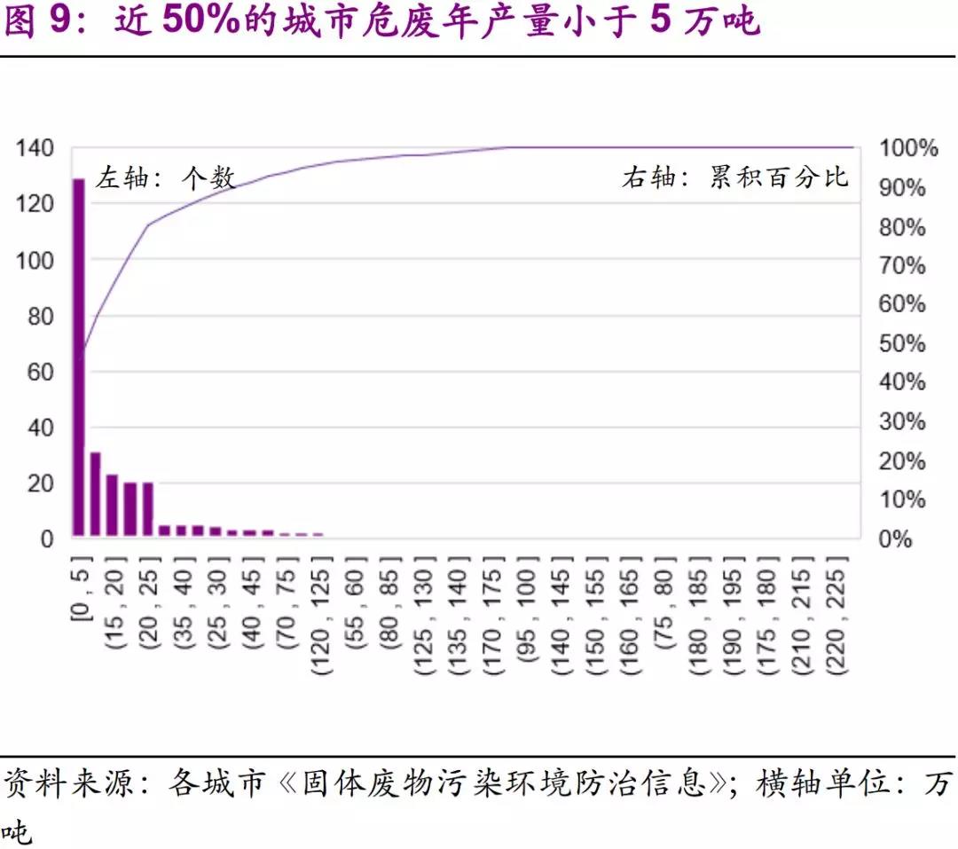分市來看,近50%的城市危廢產(chǎn)量小于5萬噸,整體呈現(xiàn)“長尾效應(yīng)”。我們對比了發(fā)布的2016-2017年《固體廢物污染環(huán)境防治信息》的城市產(chǎn)生情況,整體產(chǎn)廢大市集中在京津冀-山東、長三角、遼沈一帶、西南重工業(yè)區(qū)等地域。從產(chǎn)量分布來看,近50%的城市危廢產(chǎn)量小于5萬噸,其余城市則分布在5 -225萬噸的眾多區(qū)間,整體呈現(xiàn)“長尾效應(yīng)”。