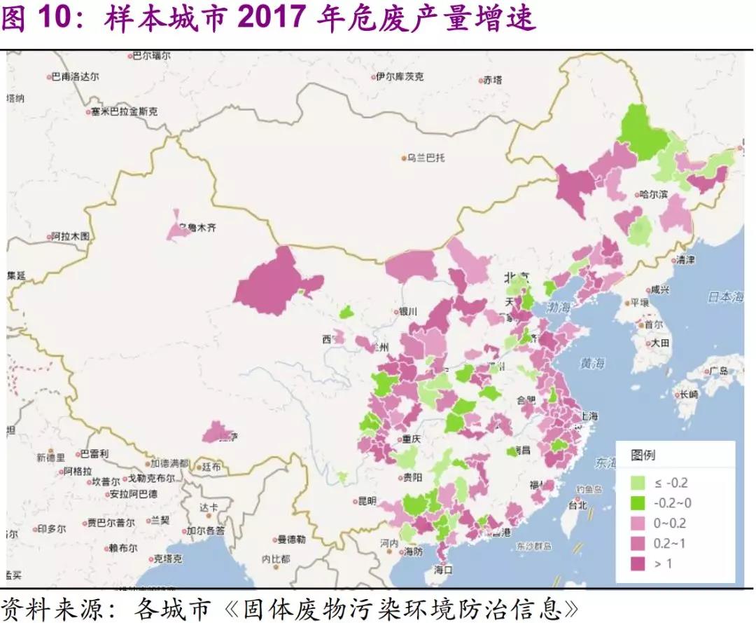 共生性體現(xiàn)在:危廢主要來源于工業(yè)生產(chǎn)過程,且治理需求反映了區(qū)域環(huán)保壓力的變化。通過對全國31省342個城市危廢信息的統(tǒng)計,我們發(fā)現(xiàn)整體產(chǎn)廢大市集中在京津冀-山東、長三角、遼沈一帶、西南重工業(yè)區(qū)等地域。從樣本數(shù)據(jù)來看,2017年全國危廢整體產(chǎn)量平均增速為18%。