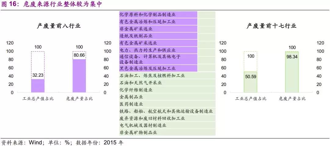 危廢產(chǎn)生行業(yè)較為集中。在國家統(tǒng)計常用40個行業(yè)中,危廢產(chǎn)量前8的行業(yè)危廢產(chǎn)生量占比達(dá)80.66%,前17的行業(yè)占比達(dá)98.34%;而相應(yīng)的工業(yè)總產(chǎn)值占比分別為32.23%和50.59%。